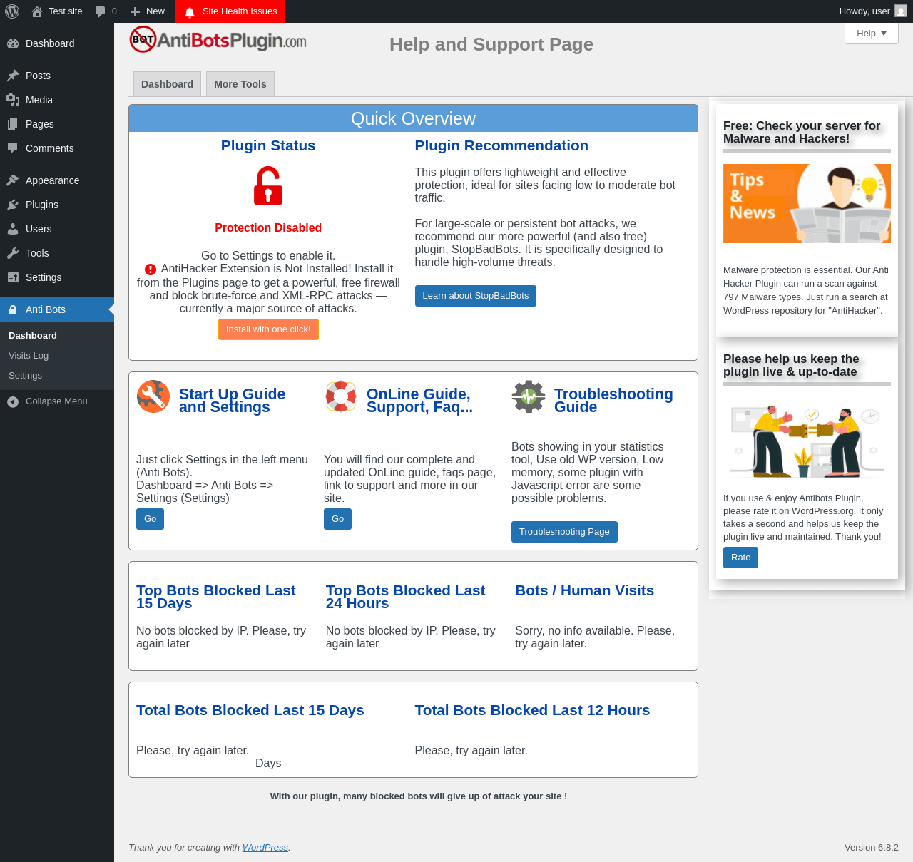 Does Antibots work with WordPress 6.8.2 and PHP 8.1.12? A smoke test was performed on .