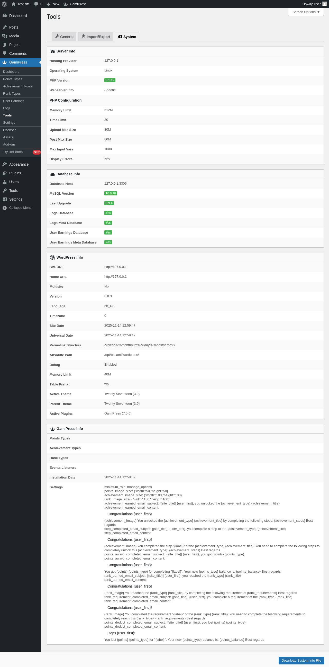 Does GamiPress work with WordPress 6.8.3 and PHP 8.1.12? A smoke test was performed on 2025-11-14 12:59:15 UTC .