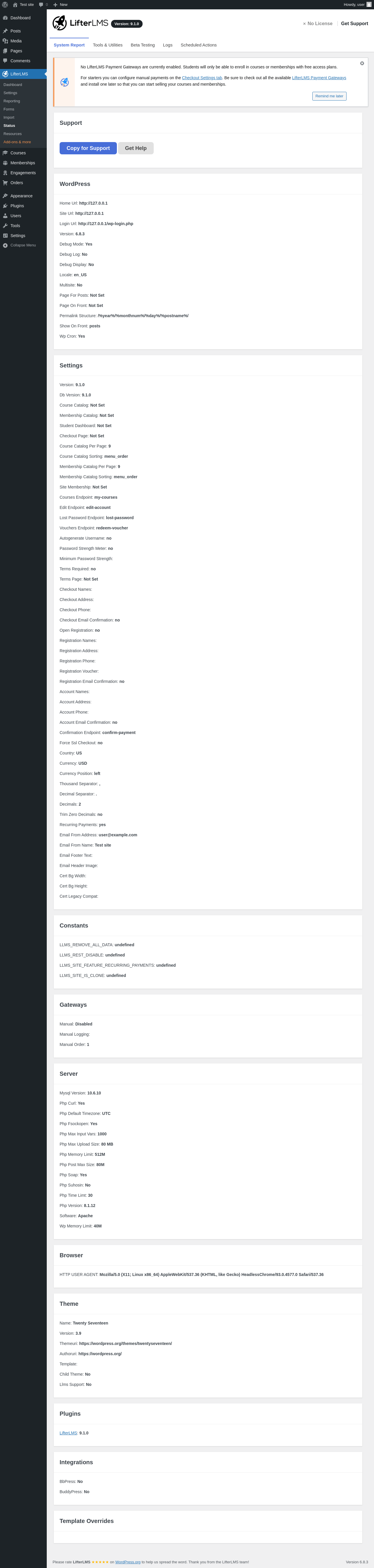 Database Tables 11 wp_lifterlms_api_keys wp_lifterlms_events wp_lifterlms_events_open_sessions wp_lifterlms_notifications wp_lifterlms_product_to_voucher wp_lifterlms_quiz_attempts wp_lifterlms_sessions wp_lifterlms_user_postmeta wp_lifterlms_voucher_code_redemptions wp_lifterlms_vouchers_codes wp_lifterlms_webhooks Options wp_options 76 _llms_first_time_setup_redirect action_scheduler_lock_async-request-runner action_scheduler_migration_status lifterlms_captcha lifterlms_certificate_default_size lifterlms_certificate_default_user_defined_height lifterlms_certificate_default_user_defined_unit lifterlms_certificate_default_user_defined_width lifterlms_checkout_force_ssl lifterlms_checkout_page_id lifterlms_content_protection lifterlms_country lifterlms_currency lifterlms_currency_position lifterlms_current_version lifterlms_db_version lifterlms_decimal_separator lifterlms_decimals lifterlms_email_footer_text lifterlms_email_from_address lifterlms_email_from_name lifterlms_email_header_image lifterlms_enable_myaccount_registration lifterlms_errors lifterlms_favorites lifterlms_first_time_setup lifterlms_membership_required lifterlms_memberships_ordering lifterlms_memberships_page_id lifterlms_memberships_per_page lifterlms_myaccount_achievements_endpoint lifterlms_myaccount_certificates_endpoint lifterlms_myaccount_confirm_payment_endpoint lifterlms_myaccount_courses_endpoint lifterlms_myaccount_courses_in_progress_sorting lifterlms_myaccount_edit_account_endpoint lifterlms_myaccount_favorites_endpoint lifterlms_myaccount_grades_endpoint lifterlms_myaccount_lost_password_endpoint lifterlms_myaccount_memberships_endpoint lifterlms_myaccount_notifications_endpoint lifterlms_myaccount_orders_endpoint lifterlms_myaccount_page_id lifterlms_myaccount_redeem_vouchers_endpoint lifterlms_prevent_concurrent_logins lifterlms_prevent_concurrent_logins_roles lifterlms_recaptcha_min_score lifterlms_recaptcha_secret_key lifterlms_recaptcha_site_key lifterlms_recurring_payment_retry lifterlms_registration_require_agree_to_terms lifterlms_retake_lessons lifterlms_shop_courses_per_page lifterlms_shop_ordering lifterlms_spam_protection lifterlms_terms_page_id lifterlms_thousand_separator lifterlms_tracked_event_saving_frequency lifterlms_trim_zero_decimals lifterlms_turnstile_secret_key lifterlms_turnstile_site_key llms_admin_notice_no-gateways llms_admin_notices llms_erasure_request_removes_lms_data llms_erasure_request_removes_order_data llms_forms_username_locations llms_grant_site_access llms_helper_version llms_permalinks llms_privacy_notice llms_rest_version llms_review llms_site_url llms_terms_notice widget_course_progress widget_course_syllabus Custom Post Types 19
