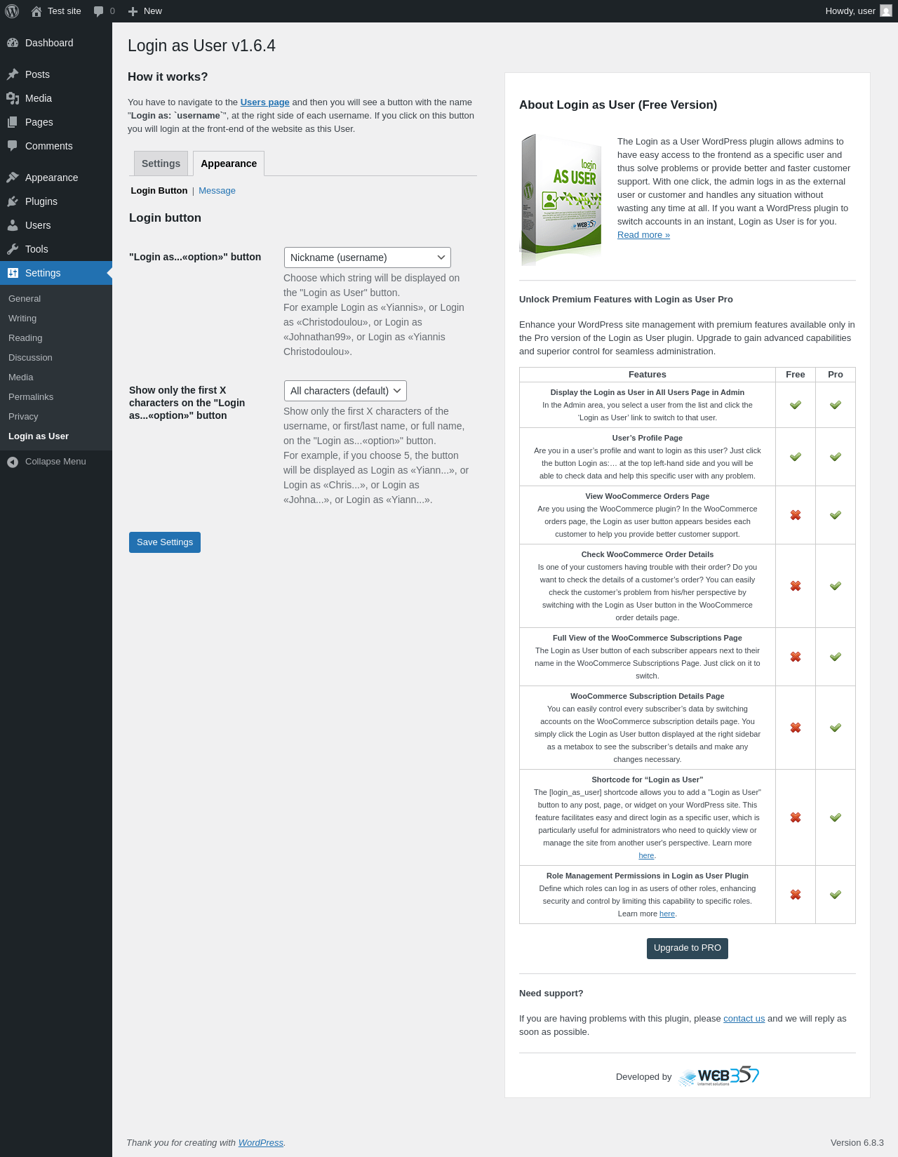 Does Login as User work with WordPress 6.8.3 and PHP 8.1.12? A smoke test was performed on .