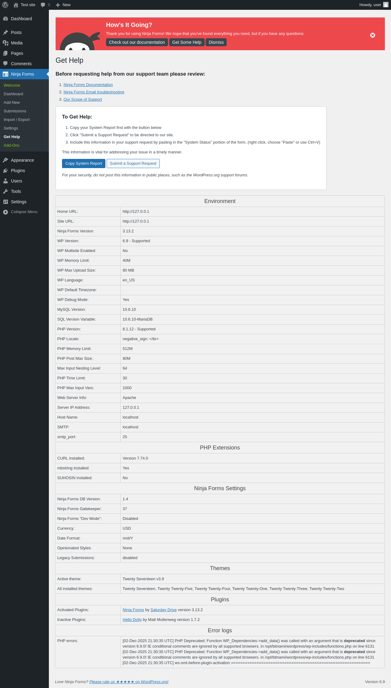 Does Ninja Forms work with WordPress 6.9 and PHP 8.1.12? A smoke test was performed on .