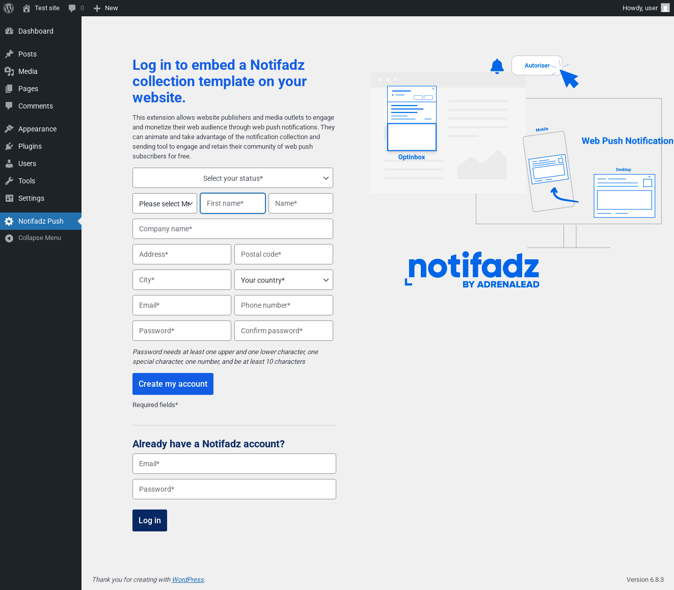 Does "Notifadz by Adrenalead - Web Push Notifications" work with WordPress 6.8.3 and PHP 8.1.12? A smoke test was performed on .
