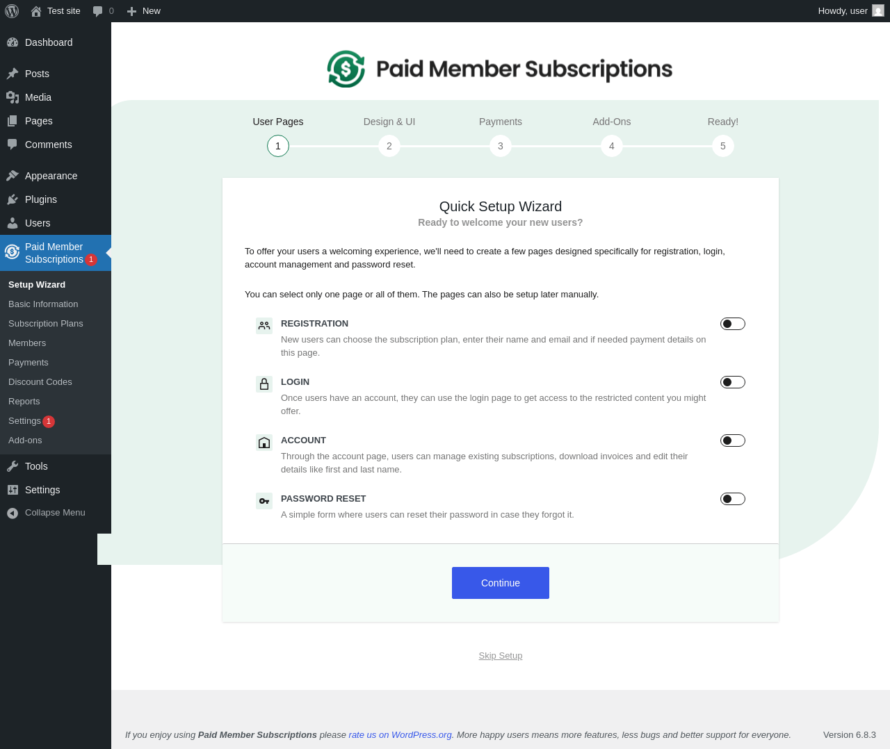 | URL | /wp-admin/admin.php?page=pms-dashboard-page&subpage=pms-setup |