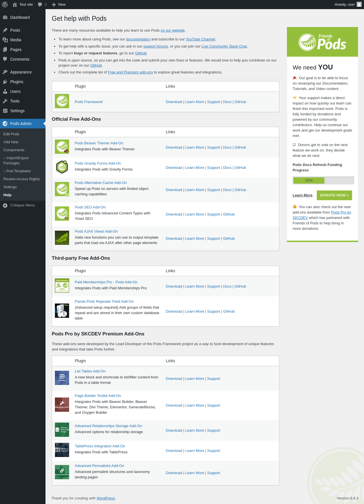 URL | /wp-admin/admin.php?page=pods-help |