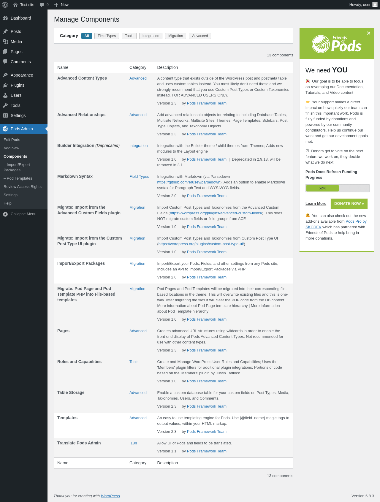 URL | /wp-admin/admin.php?page=pods-components |