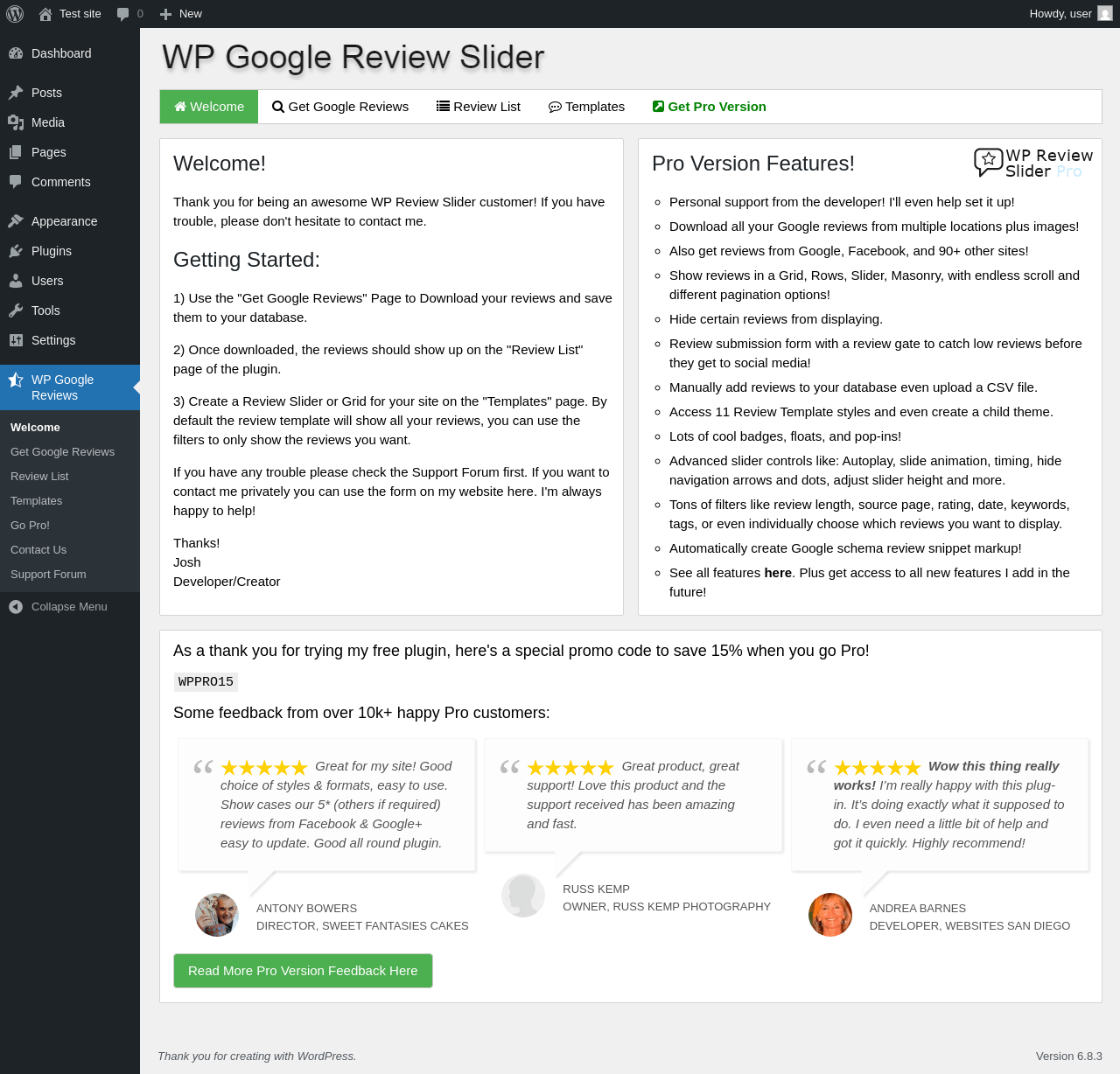 Does WP Google Review Slider work with WordPress 6.8.3 and PHP 8.1.12? A smoke test was performed on .