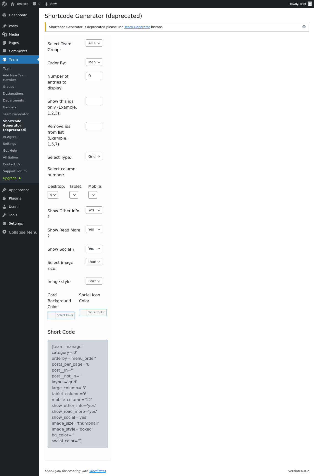 Team → Shortcode Generator (deprecated)